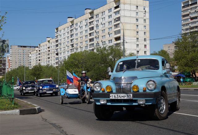 А с 11 часов до 11-30 (перед самим Парадом), для владельцев автомотостарины состоялся , как и всегда, Агит-пробег по Москве. По выделенному маршруту колонну сопровождали мотоциклы ГИБДД. Колонну ретромашин по маршруту пробега профессионально и чётко, отлично просто, провели мотоциклисты из ГИБДД ЮВАО г. Москвы!